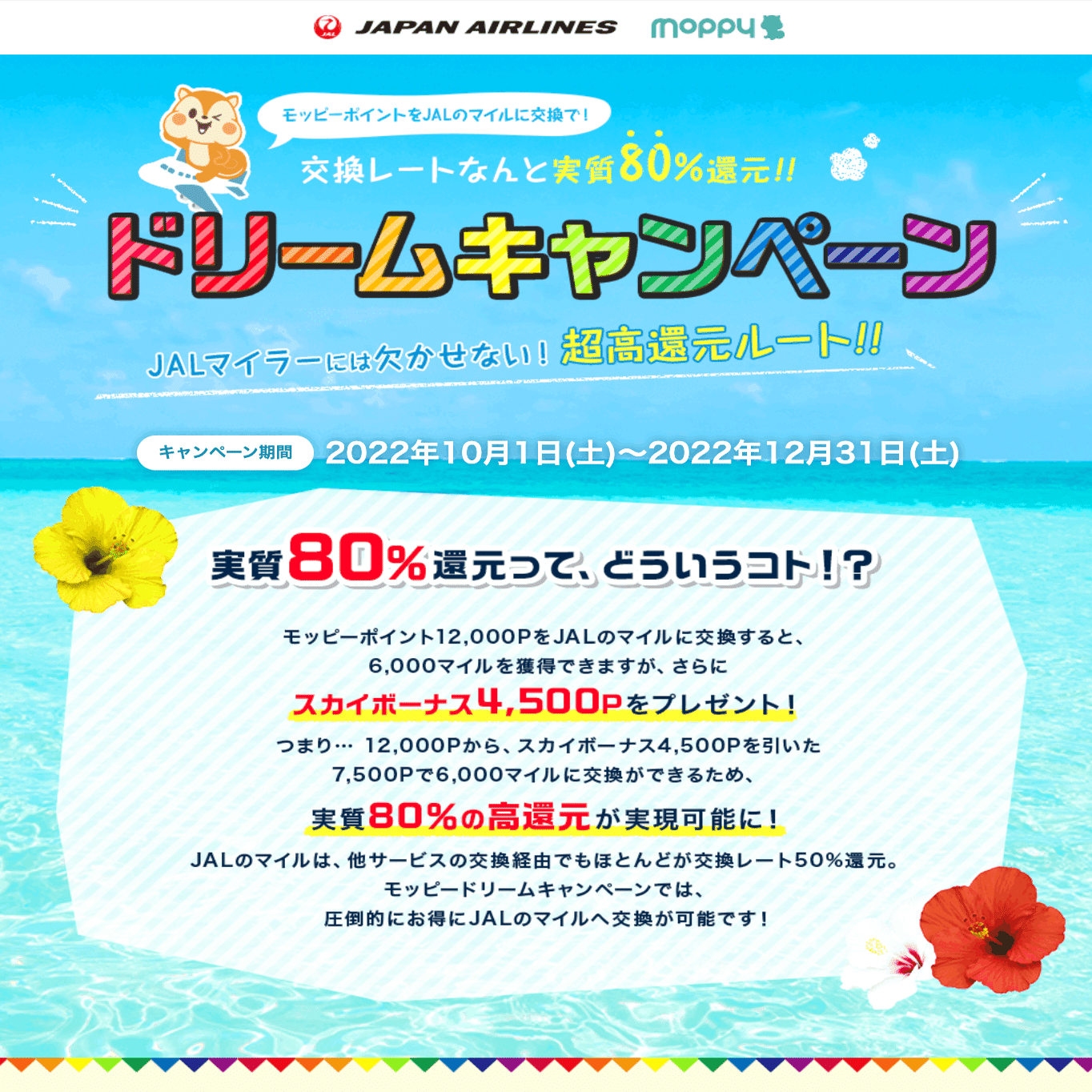 一人当たり6,000マイル(2022年11月現在)ですが、これは、例えばポイントサイトのモッピーで12,000P分貯めれば交換可能。以下のドリームキャンペーンの条件を満たせば後から4,500Pが返ってきますので、実質80%の還元率でマイルに交換できます。