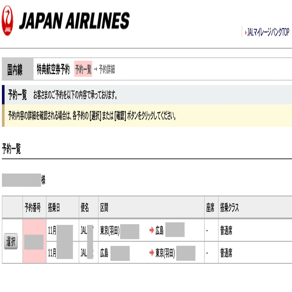 候補地が決まると、以下のような「特典航空券予約」ページが確認できます。今回、私は「広島」になりました。